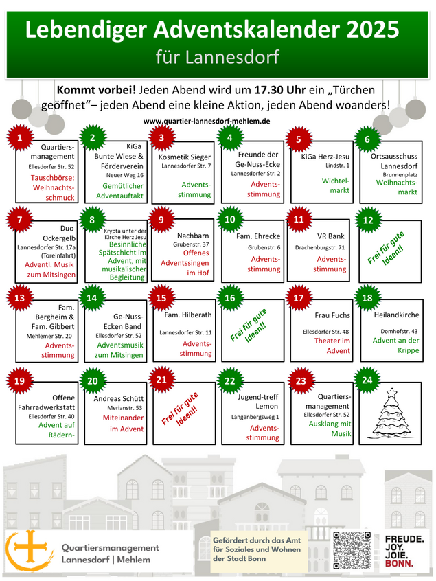 Wir richten uns an ALLE Menschen in Lannesdorf und Mehlem. Wir bringen die Bürgerinnen und Bürger sowie Akteure miteinander ins Gespräch. Wir ermöglichen Begegnung zwischen Kulturen und Generationen. Wir sammeln und entwickeln mit den Bewohnerinnen und Bewohnern neue Ideen für Lannesdorf und Mehlem. Wenn Hilfe benötigt wird, suchen wir nach Lösungen. Gefördert werden wir vom Amt für Soziales und Wohnen der Bundesstadt Bonn.