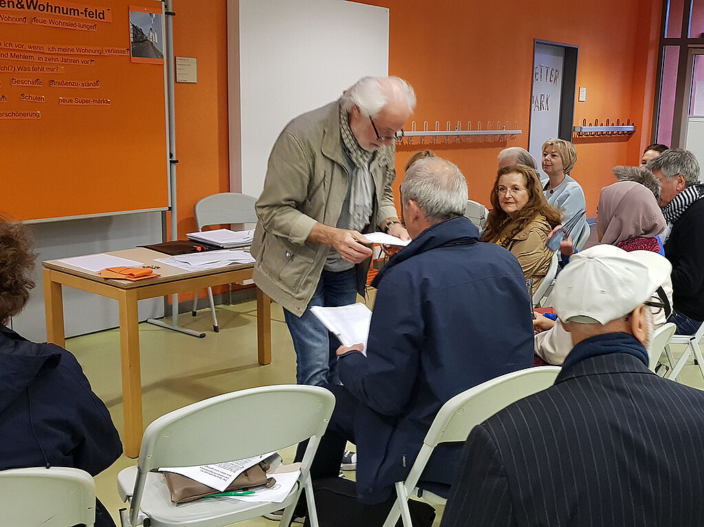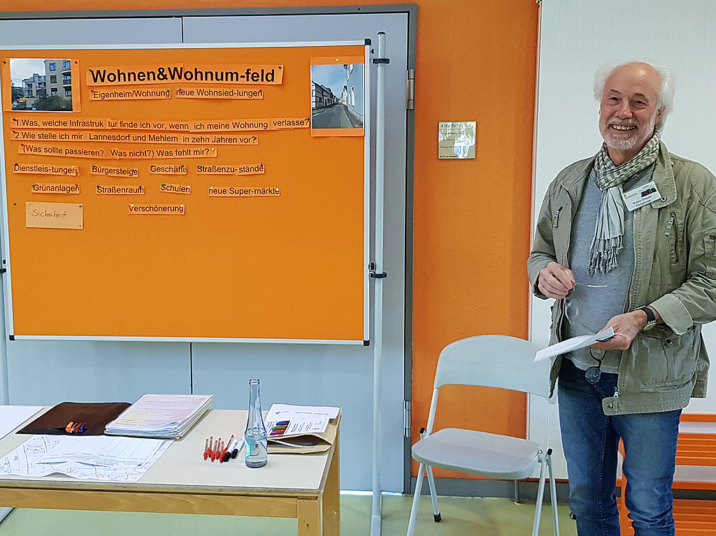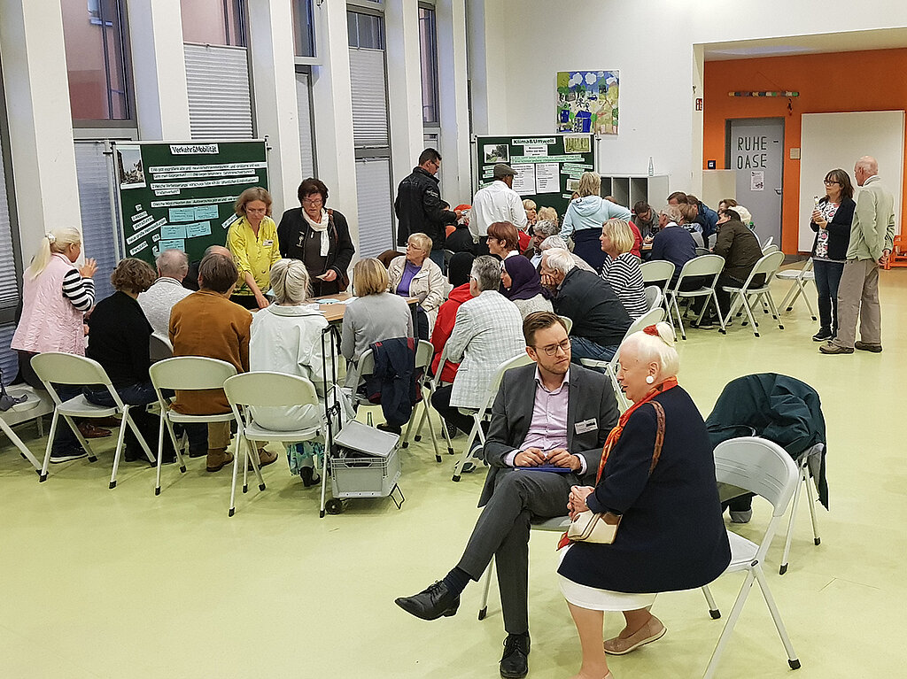 Nach den Grußworten von Dagmar Müller, leitende Pfarrerin der Frauenhilfe (die die Arbeit des Quartiersmanagements vorstellte), und Bezirksbürgermeister Christoph Jansen (der Unterstützung der Politik für die weiter Arbeit versprach) wurde zur Gruppenarbeit an vier Thementische eingeladen, wo eine ganze Reihe Experten aus Politik und Verwaltung Rede und Antwort standen. Nach einstündigen Diskussionen stellten vier Gruppensprecher die Ergebnisse vor:
